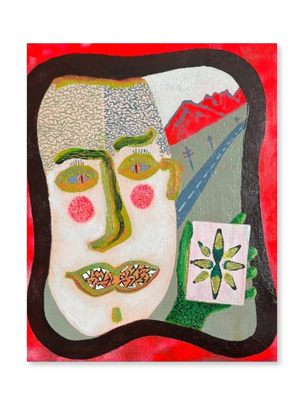Postcard from Roswell is a collection of contemporary folk-art portraits and masks (mug shots, wanted posters on a decaying post office wall, / the senior class from the bad dream yearbook). I ask myself if painting these faces is an exercise in mining deep memory. I had that thought when my mother viewed several of my early attempts and stopped suddenly saying, “I know this person—who is this?” I, too, had recognized a persona. What I painted looked little like anyone we knew, but it captured a recognizable essence. My first impulse with a blank canvas is to paint a face. Occasionally I recognize it, or some aspect of it. More often, an image arrives and claims its own personhood.