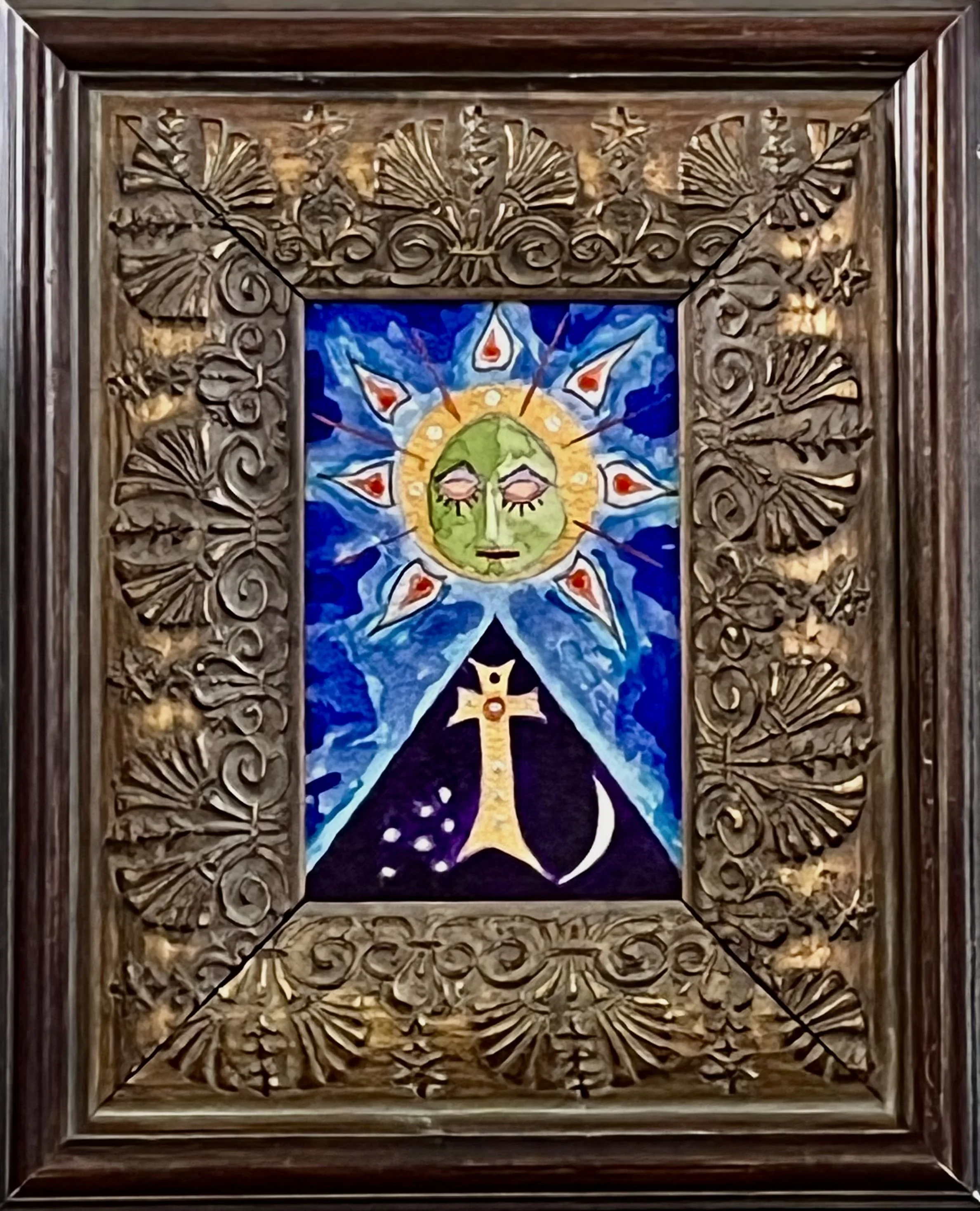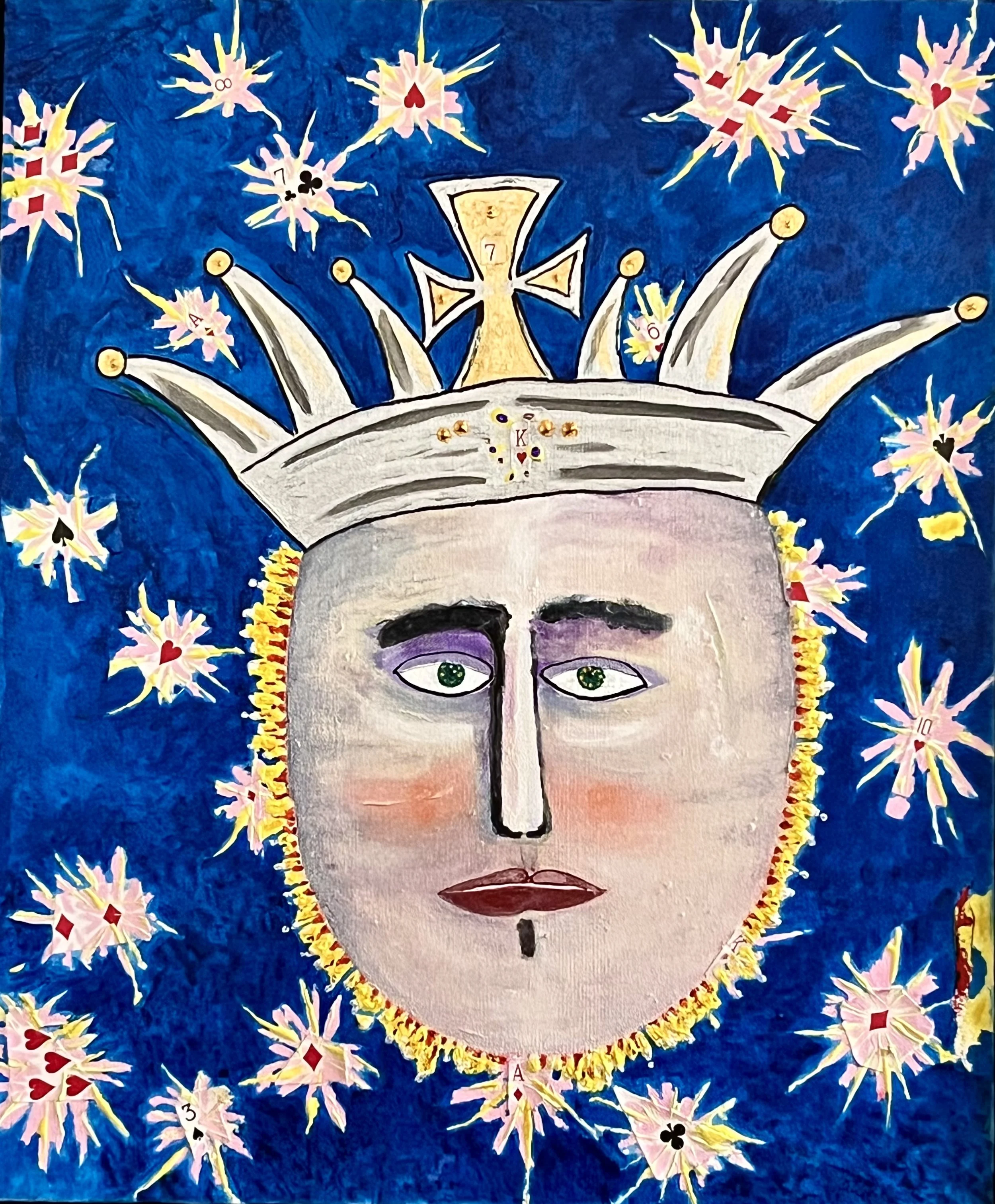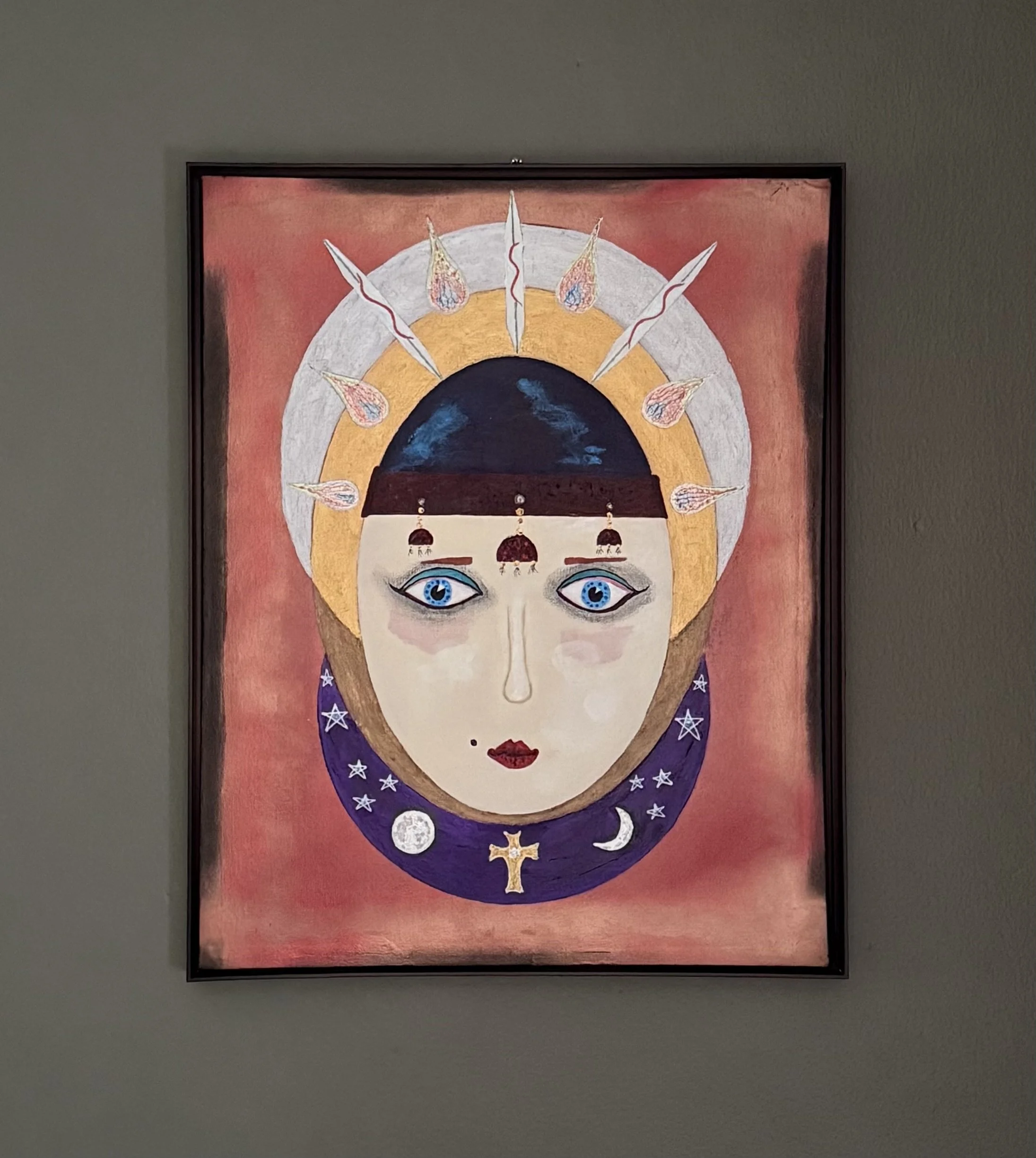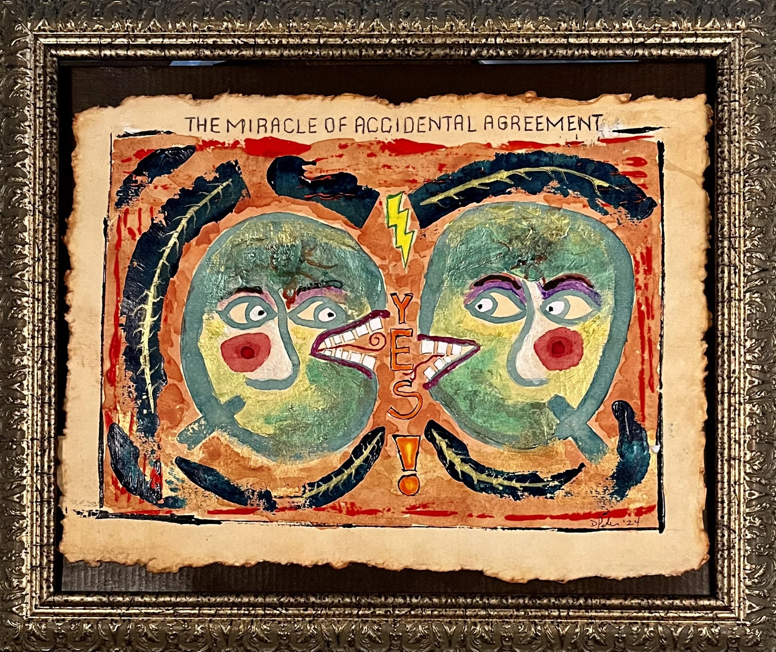 At age five, I began drawing pictures with a sense that they were art—simple images in uncomplicated settings. Much of my visual art still exhibits that tendency. I paint a lot of faces—portraits and masks. “Contemporary folk artist” is what I call myself; some have categorized me as an “outsider” artist. That’s fine with me. I paint because I have the urge to do so. It fills an empty room in my human experience. I love it when one of my paintings does the same for someone else.